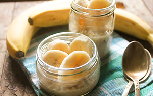 - In a medium-sized bowl, add two bananas and mash until a thick puree is formed. Slice remaining banana into ½-inch pieces and set aside.